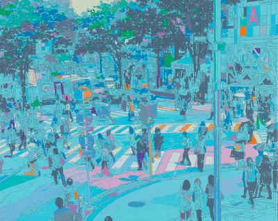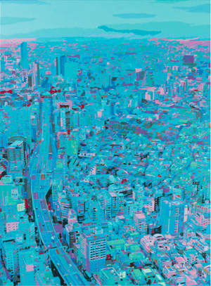 Her paintings are created from photographic images, often taken by the artist herself, in which family portraits, teenagers in the street in the quarters of Tokyo where young people hang out such as Shibuya, Harajyuku, Ginza interchange with urban views of Tokyo, she shows also " Tokyo landscape series.