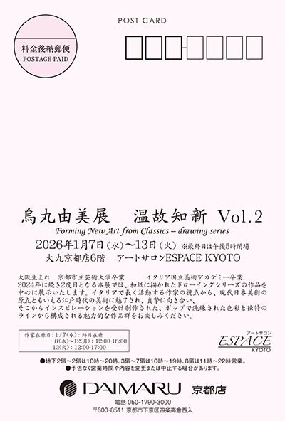 会場は京都大丸エスパス京都‐ESPACE KYOTOで、2024年に続いて2回目となる個展「烏丸由美展 温故知新 Vol.2 - Forming New Art from Classics – drawing series」がスタートします。1月13日(火)まで。皆さまのご来場を心よりお待ち申し上げております。(在廊予定も記載しています。)