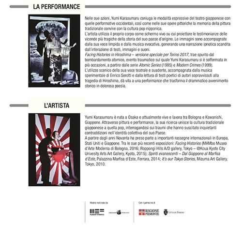 Facing Histories in Hiroshima – Torino 2017 special version, moves from the atomic bombing, a traumatic event on which have dwelled in many occasion, starting from the Atomic Series (1995) and Modern Crimes (1999) in painting. The scenic use of her clear and mellow voice, accompanied by the sperimental music of Enrico Serotti and the reading of poems written by authors who survived the Hiroshima tragedy, bring life to a performance which transforms the dramatic event into a painful poem.