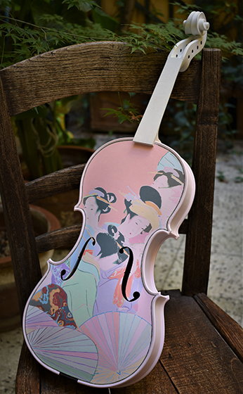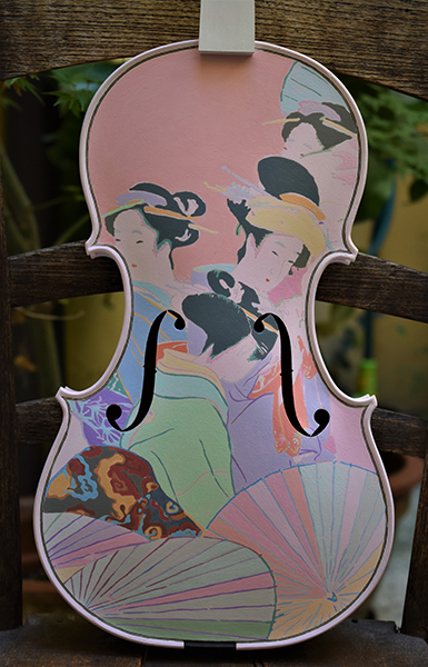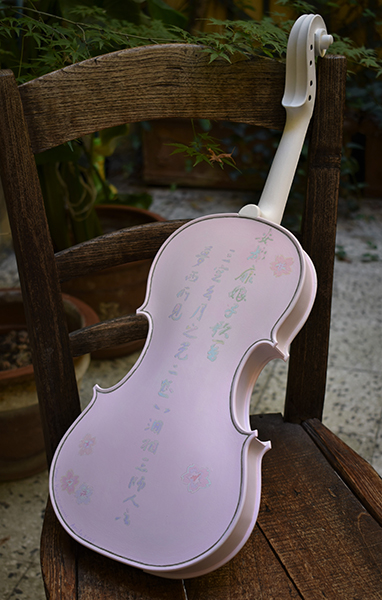 Ezia di Labio, the violin luthier, asked me to paint on a violin as part of the project "Violini d'Aurore". The inspiration came from the ancient Japanese traditional art of painted women and images of “hagoita”. A hagoita is a wooden racket decorated with a beautifully painted or quilted image of a woman used for New Year’s outdoor games similar to badminton. On the back of the violin, I brushed an ancient romantic poem of "Manyò-shu" from the 11th century over the background of a cherry blossom painting. When this pandemic ends a violin concert will be planned using this painted instrument.