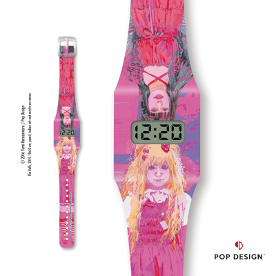 POP DESIGN now collaborates with the painter and performance artist YUMI KARASUMARU and presents their new wristwatch ‘The Dolls Pappwatch’, as a limited edition of only 100 pieces, featuring the two standing Harajuku girls from her art piece The Dolls (2014, 70 x 50 cm, Indian ink, pencil and acrylic on canvas).